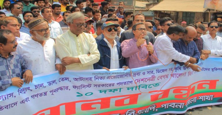 নিত্য প্রয়োজনীয় দ্রব্য ও কৃষি পণ্যের মূল্য বৃদ্ধি, গণতন্ত্র পুনরুদ্ধার এবং দলের চেয়ারপারসন বেগম খালেদা জিয়ার মুক্তিসহ ১০ দফা দাবিতে পাবনায় মানববন্ধন কর্মসূচি পালন করেছে বিএনপি।
