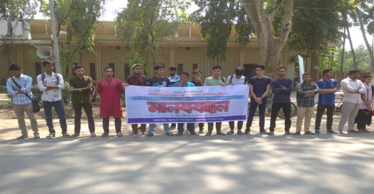 রাজশাহী বিশ্ববিদ্যালয়ের (রাবি) আবাসিক হলের ডাইনিং-ক্যান্টিনে ‘নিরাপদ’ খাবারের দাবি জানিয়েছে সনাতন ধর্মাবলম্বী শিক্ষার্থীরা। আজ(২৭ মার্চ) সোমবার দুপুর একটায় বিশ্ববিদ্যালয়ের প্যারিস রোডে এক মানববন্ধন থেকে এসব দাবি জানান শিক্ষার্থীরা। এসময় তারা প্রতিটি হলে প্রার্থনা কক্ষসহ একাধিক দাবি জানান।