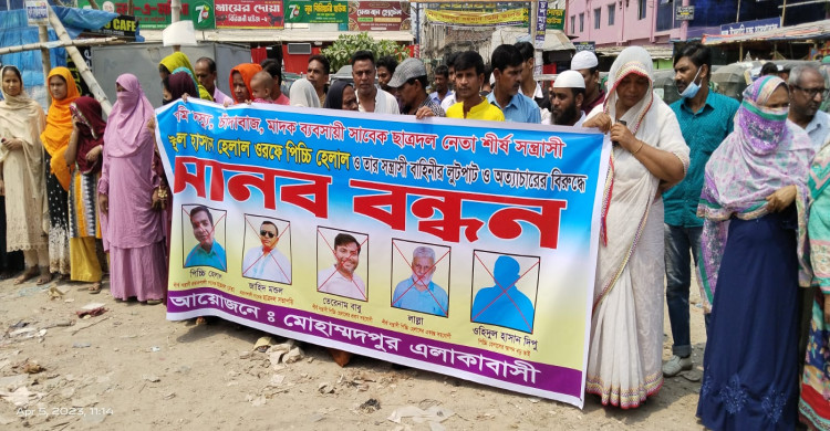 আজ বুধবার ৫ এপ্রিল বেলা ১১ টায় মোহাম্মদপুর বেড়িবাঁধ চার রাস্তার মোড়ে ভূমি দস্যু, চাঁদাবাজ, মাদক ব্যাবসায়ী,সাবেক ছাত্রদল নেতা শীর্ষ সন্ত্রাসী পিচ্চি হেলাল ও তার সন্ত্রাসী বাহিনীর লুটপাট ও অত্যাচারের বিরুদ্ধে মোহাম্মদ পুর বাসি মানববন্ধন করে । এতে প্রায় একশ লোক অংশগ্রহণ করেন। তাদের দাবি সন্ত্রাস মুক্ত মোহাম্মদপুর চাই।
