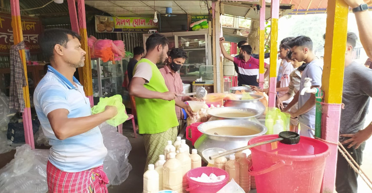 বৃহস্পতিবার উপজেলার সলপ রেলস্টেশন এলাকায় গিয়ে দেখা যায়, স্টেশনের পাশে ঘোলের দোকানগুলো জমে উঠেছে রমরমা। দোকানের সামনে মাটির পাত্রে পসরা সাজিয়ে চলছে বিক্রি।