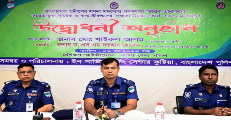 কুষ্টিয়ায় পুলিশ সদস্যের পদমর্যাদা ভিত্তিক দক্ষতা উন্নয়ন কোর্সর আওতাভুক্ত নায়েক ও কনস্টেবলদের “দক্ষতা উন্নয়ন কোর্স-১০ম ব্যাচের” উদ্বোধনী অনুষ্ঠান অনুষ্ঠিত হয়েছে। শনিবার (০৬ মে) ২০২৩ কুষ্টিয়া জেলা পুলিশের আয়োজনে পুলিশ লাইন্স, সম্মেলন কক্ষে এ প্রশিক্ষণ কর্মসূচির উদ্বোধনী অনুষ্ঠান অনুষ্ঠিত হয়। উক্ত উদ্বোধনী অনুষ্ঠানে প্রধান অতিথি হিসেবে উপস্থিত ছিলেন জনাব মোঃ খাইরুল আলম, সুযোগ্য পুলিশ সুপার, কুষ্টিয়া।