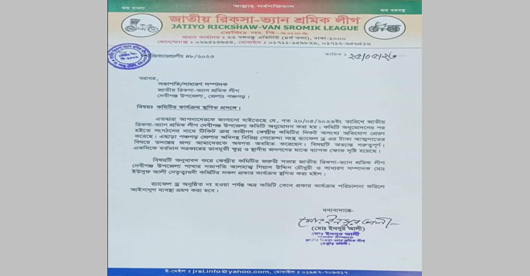 পঞ্চগড়ে জাতীয় রিকসা-ভ্যান শ্রমিক লীগের কমিটি অনুমোদনের ৫ দিন পরই তা স্থগিত করেছে কেন্দ্রীয় কমিটি। গত বৃহস্পতিবার (২৫ মে) কেন্দ্রীয় কমিটির সাধারণ সম্পাদক ইনসুর আলী স্বাক্ষরিত এই সংক্রান্ত একটি বিজ্ঞপ্তি প্রকাশ করা হয়।