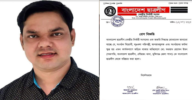বিজ্ঞপ্তিতে বলা হয়,বাংলাদেশ ছাত্রলীগ কেন্দ্রীয় নির্বাহী সংসদের এক জরুরি সিদ্ধান্ত মোতাবেক সংগঠন বিরোধী, শৃঙ্খলা পরিপন্থী, অপরাধমূলক এবং সংগঠনের মর্যাদা ক্ষুণ্ন হয় এমন কার্যকলাপে জড়িত থাকার অভিযোগে লৌহজং উপজেলা ছাত্রলীগ সভাপতি মো.ফরহাদ হোসেন ইমনকে বাংলাদেশ ছাত্রলীগ থেকে বহিষ্কার করা হলো। নির্দেশক্রমে এ বিষয়ে মুন্সিগঞ্জ জেলা ছাত্রলীগের সভাপতি ফয়সাল মৃধা আজ মঙ্গলবার জানান,গতকাল সোমবার ফরহাদের বিরুদ্ধে আনীত অভিযোগ এবং জেলহাজতে থাকার বিষয়টি নিশ্চিত হই।বিষয়টি কেন্দ্রীয় সংসদকে জানানো হয়। তারা সকল দিক বিবেচনা করে সোমবার রাতে ফরহাদ হোসেনকে দলীয় পদ থেকে অব্যাহতি দিয়েছে। এর আগে গত রোববার চেক জালিয়াতির মামলায় ঢাকার বিজ্ঞ মুখ্য মহানগর হাকিমের আদালতে অগ্রীম জামিন চাইতে গেলে বিচারক জামিন নামঞ্জুর করে কারাগারে পাঠানোর নির্দেশ দেন। ঢাকার ইসলামপুরের কাপড় ব্যবসায়ী সোহেল আহমেদের পক্ষে আনোয়ার হোসেন রিয়েল চেক জালিয়াতির সাতটি মামলা দায়ের করেন ছাত্রলীগের এই নেতার বিরুদ্ধে।