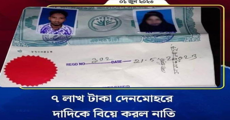 অবশেষে আলোচিত / সমালোচিত ভোলার চরফ্যাসন উপজেলার হাজারীগন্জ ইউনিয়নের সংঘটিত ইসলামী শরীয়া নিষিদ্ধ দাদী নাতির বিবাহ বিচ্ছেদ হয়েছে। গত ১জুন ভোলার একটি আদালতে ৭ লাখ টাকা দেনমহরে কোর্ট ম্যারেজের মাধ্যমে ওই বিবাহ করে সংসার শুরু করেন নাতি ও দাদী।