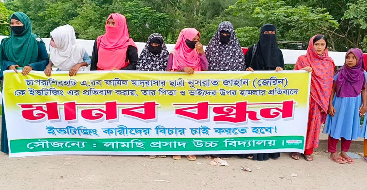 মাদ্রাসা ছাত্রীকে ইভটিজিংয়ের প্রতিবাদে মানববন্ধন