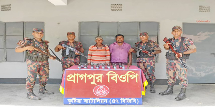 কুষ্টিয়া ব্যাটালিয়ন ( ৪৭ বিজিবি ) এর অধীনস্থ প্রাগপুর বিওপি'র দায়িত্বপূর্ণ এলাকার সীমান্ত পিলার ১৪৮ / ৩ - এস হতে আনুমানিক ১০০ গজ বাংলাদেশের অভ্যন্তরে প্রাগপুর গোরস্থান মাঠ নামক স্থানে মাদক ও চোরাচালান বিরোধী অভিযান পরিচালনা করে বাংলাদেশী নাগরিক ১। মোঃ লাভলু ( ৫৫ ) , পিতাঃ মৃত তাছেন আলী , ২। মোঃ মহিবুল ইসলাম মিলন ( ৫০ ) , পিতাঃ মৃত মফের আলী উভয়ের ঠিকানা গ্রামঃ প্রাগপুর , পোষ্টঃ চরপ্রাগপুর , থানাঃ দৌলতপুর ও জেলাঃ কুষ্টিয়া’কে ভারতীয় ২৯ বোতল ফেন্সিডিল , ০১ টি হাসুয়া এবং ০১ টি প্লাস্টিকের বস্তাসহ আটক করে । আটককৃত মাদকদ্রব্য ও অন্যান্য মালামালের আনুমানিক সিজার মূল্য ১১,৯২০ / - টাকা ।অন্য অভিযানে কুষ্টিয়া ব্যাটালিয়ন ( ৪৭ বিজিবি ) এর অধীনস্থ রামকৃষ্ণপুর বিওপি'র দায়িত্বপূর্ণ এলাকার সীমান্ত পিলার ১৫৬ / ২ - এস হতে আনুমানিক ১০০০ গজ বাংলাদেশের অভ্যন্তরে মোহাম্মদপুর বাজার নামক স্থানে মাদক ও চোরাচালান বিরোধী অভিযান পরিচালনা করে বাংলাদেশী নাগরিক মোঃ মোক্তার হোসেন ( ৫০ ) পিতাঃ মৃত সোলেমান জোয়াদ্দার , গ্রামঃ মোহাম্মদ পুর , ডাকঃ ইনসাফনগর , থানাঃ দৌলতপুর জেলাঃ কষ্টিয়া'কে ভারতীয় ০.০০২ কেজি হেরোইন এবং ০৬ পিস ট্যাপেন্ডল ট্যাবলেটসহ আটক করে । আটককৃত মাদকদ্রব্যের আনুমানিক সিজার মূল্য ৫,৮০০ / - টাকা । আটককৃত মাদকদ্রব্যসহ আসামীকে কুষ্টিয়া দৌলতপুর থানায় সোপর্দ করতঃ মামলা দায়ের করার কার্যক্রম প্রক্রিয়াধীন রয়েছে ।
