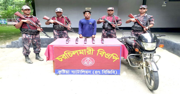 কুষ্টিয়া ব্যাটালিয়ন ( ৪৭ বিজিবি ) এর অধীনস্থ চরচিলমারী বিওপি'র দায়িত্বপূর্ণ এলাকার সীমান্ত পিলার ১৫৭ / ২ - এস হতে আনুমানিক ০১ কিঃ মিঃ বাংলাদেশের অভ্যন্তরে সোনাতলা মাঠ নামক স্থানে নায়েক মোঃ রিতু মিয়া এর নেতৃত্বে মাদক ও চোরাচালান বিরোধী অভিযান পরিচালনা করে বাংলাদেশী নাগরিক মোঃ হৃদয় আহম্মেদ ( ২০ ) , পিতাঃ কালাম বিশ্বাস , গ্রামঃ চরসাদীপুর , ডাকঘরঃ বাহিরমাদী , থানাঃ দৌলতপুর , জেলাঃ কুষ্টিয়া’কে ভারতীয় ১৫ বোতল ফেন্সিডিল এবং ০১ টি ১০০ সিসি রানার মোটরসাইকেলসহ আটক করে । আটককৃত ফেন্সিডিল ও মোটরসাইকেল এর আনুমানিক সিজার মূল্য ১,০৬,০০০ / - টাকা । আটককৃত ফেন্সিডিল ও মোটরসাইকেলসহ আসামীকে কুষ্টিয়া জেলার দৌলতপুর থানায় সোপর্দ ও মামলা দায়ের করার কার্যক্রম প্রক্রিয়াধীন রয়েছে।