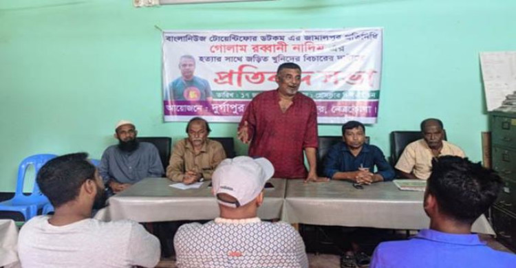 জামালপুরের বকশীগঞ্জে সন্ত্রাসীদের হামলায় বাংলা নিউজ টুয়েন্টি ফোর ডটকম ও ৭১ টেলিভিশনের জামালপুর প্রতিনিধি গোলাম রাব্বানী নাদিম হত্যার সাথে জড়িতদের বিচারের দাবিতে নেত্রকোনার দুর্গাপুরে এক প্রতিবাদ সভা অনুষ্ঠিত হয়েছে। শনিবার (১৭ জুন) দুপুরে দুর্গাপুর প্রেসক্লাব মিলনায়তনে এ প্রতিবাদ সভা অনুষ্ঠিত হয়।