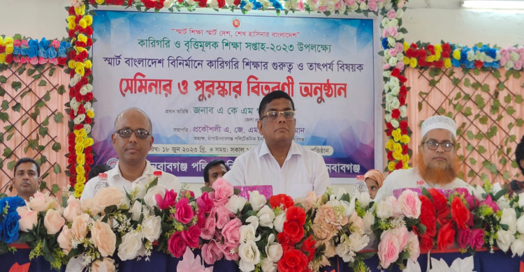 চাঁপাইনবাবগঞ্জ জেলা প্রশাসক এ কে এম গালিভ খান বলেন সাধারণ শিক্ষার্থীদের শ্রম বাজারের জন্য দক্ষ ও উপযোগী করতে বিভিন্ন কার্যক্রম গ্রহণ ও বাস্তবায়ন করছে সরকার। তিনি বলেন, এই কার্যক্রমের অংশ হিসেবে শিক্ষার্থীদের বৃত্তিমূলক দক্ষতা দেয়ার জন্য শিক্ষাক্রমে কারিগরি কোর্স অন্তর্ভুক্ত করা হচ্ছে। আগামীতে ও শিক্ষা কারিকুলামেও অনেক পরিবর্তন আসছে। স্মার্ট বাংলাদেশ বিনির্মানে কারিগরি শিক্ষার্থীদের দক্ষ করে গড়ে তুলতে হবে। তাদের উদ্বোনী শক্তি বৃদ্ধি করে প্রযুক্তিগত বুদ্ধিমত্তাকে কাজে লাগিয়ে স্মার্ট বাংলাদেশ নির্মাণে কাজ করার আহবান জানান। জেলা প্রশাসক এ কে এম গালিভ খান চাঁপাইনবাবগঞ্জ পলিটেকনিক ইনষ্টিটিউটে স্মার্ট বাংলাদেশ বিনির্মানে কারিগরি ও বৃত্তিমূলক শিক্ষা সপ্তাহ-২০২৩ এর সমাপনী অনুষ্ঠানে কারিগরি শিক্ষার গুরুত্ব ও তাৎপর্য বিষয়ক সেমিনার ও পুরসকার বিতরণ অনুষ্ঠানে এ কথা বলেন।তিনি দেশের সাধারণ জনগণের কাছে কারিগরি ও বৃত্তিমূলক শিক্ষার প্রয়োজনীয়তা ও সার্বিক আর্থ-সামাজিক উন্নয়নের ভূমিকা তুলে ধরার উপর গুরুত্বারোপ করেন।জেলা প্রশাসক, শিল্প-কারখানা ও ইন্ডাস্ট্রির চাহিদা অনুযায়ী কারিগরি শিক্ষানীতি, কারিকুলাম প্রণয়ন ও জব ম্যাচিং করে কারিগরি শিক্ষাকে আরো কর্মমুখী করতে উদ্যোগ গ্রহণ করেছে জাতীয় দক্ষতা উন্নয়ন কর্তৃপক্ষ (এনএসডিএ)।। কারিগরি শিক্ষার প্রসারে সম্পৃক্ত সরকারি-বেসরকারি ও বিদেশি সংস্থার মধ্যে কার্যকর সমন্বয় বাড়াতেও সরকার কাজ করে যাচ্ছে। চাঁপাইনবাবগঞ্জ পলিটেকনিক ইনষ্টিটিউট এর হলরুমে রোববার সকাল সাড়ে ১১ টায় অধ্যক্ষ প্রকৌশলী এ.জে.এম মাসুদুর রহমান এর সভাপতিত্বে সমাপনী অনুষ্ঠানে অন্যদের মধ্যে বক্তব্য প্রদান করেন ইলেকট্রিক্যাল বিভাগের চীফ ইন্সট্রাক্টর আফিদা রহমান,পলিটেকনিক ইনষ্টিটিউট এর চিফ ইন্সট্রাক্টর দূর্গা চরন,প্রকৌশলী জাহাঙ্গীর আলম প্রমুখ। এসময় উপস্থিত ছিলেন চীফ ইন্সট্রাক্টর টেক ফুড ড ঃ মোঃ আরিফুল ইসলাম, চীফ ইন্সট্রাক্টর টেক ফুড মোঃ সুবেল আলী সহ ছাত্র-ছাতী ও বিভিন্ন কারিগরি শিক্ষাপ্রতিষ্ঠানের শিক্ষকগণ উপস্থিত ছিলেন।