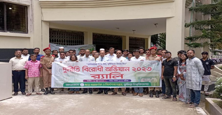 কুমিল্লা বিশ্ববিদ্যালয়ের ছাত্র পরামর্শক ও নির্দেশনা দপ্তরের আয়োজনে দুর্নীতি বিরোধী অভিযান-২০২৩ উপলক্ষে কুমিল্লা বিশ্ববিদ্যালয়ে একটি র্যালি হয়েছে। এই র্যালি প্রতিপাদ্য বিষয় হচ্ছে 'দেশপ্রেমের শপথ নিন, দুর্নীতিকে বিদায় দিন'।