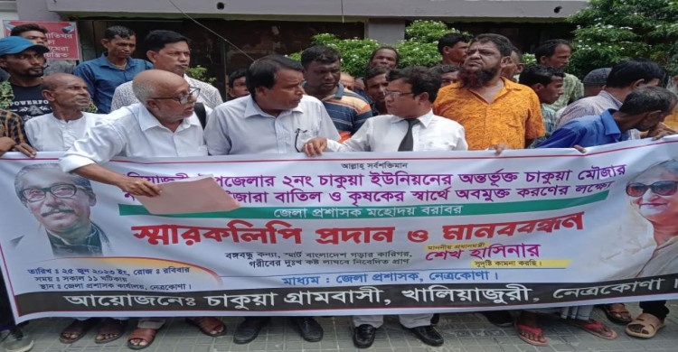 নেত্রকোণার খালিয়াজুরী উপজেলাধীন চাকুয়া ইউনিয়নের চাকুয়া গ্রামবাসী নেত্রকোণা প্রশাসক বরাবর স্বারকলিপি প্রদান ও নাইওরী খালের ইজারা বাতিলের দাবীতে নেত্রকোণা জেলা প্রশাসকের কার্যালয়ের সামনে মানব বন্ধন করেন চাকুয়া গ্রামবাসী।