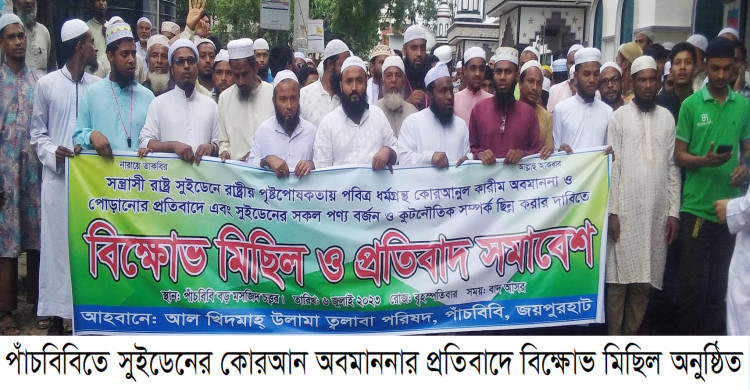 পাঁচবিবিতে সুইডেনের রাষ্ট্রীয় পৃষ্টপোষকতায় পবিত্র ধর্মগ্রন্থ কোরআনুলকারীম অবমাননা ও আগুণে পোড়ানোর প্রতিবাদে এবং সুইডেনের সকল পণ্য বর্জন ও কুটনৈতিক সম্পর্ক ছিন্ন করার দাবিতে আল খিদমাহ্ উলামা ত্বলাবা পরিষদের উদ্যোগে বিক্ষোভ মিছিল ও প্রতিবাদ সমাবেশ অনুষ্ঠিত হয়েছে। গতকাল বৃহস্পতিবার ৬ জুলাই বাদ আছর পাঁচবিবি বাইতুন নূর জামে মসজিদের সামনে থেকে এই বিক্ষোভ মিছিল শুরু হয়। শহর প্রদক্ষিণ শেষে গোহাটী মুক্তিযোদ্ধা কমপ্লেক্স চত্ত্বরে এসে শেষ হয়। সেখানে প্রতিবাদ সমাবেশে সভাপতিত্ব করেন আল খিদমাহ্ উলামা ত্বলাবা পরিষদের হাফেজ মাওলানা বোরহান উদ্দিন। প্রধান অতিথির বক্তব্য রাখেন শাইখুল হাদিস আল্লামা আব্দুল হামিদ। বক্তব্য রাখেন হাফেজ জামিল আহম্মেদ, মাও: সাইফুল ইসলাম, মাও: আব্দুল ওয়াদুদ, মাও: আখতার হোসাইন, মাও: মামুনুর রশিদ, মাও: ওমর ফারুক, মুফতি জোবাইর মাহমুদ, হাফেজ ইব্রাহিম সবুজ, মাও: ইসতিয়াক হোসেন প্রমুখ। অনুষ্ঠান পরিচালনায় ছিলেন হাফেজ রাজিবুল হাসান, হাফেজ মিজানুর রহমান ও হাফেজ নুরনবী হোসেন।
