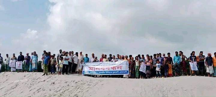 কুষ্টিয়া জেলার মিরপুর উপজেলার বারুইপাড়া ইউনিয়ন এর মির্জানগর গ্রামে পদ্মার অব্যাহত ভাঙ্গন রোধে এবং নদী পাড়ের তোলা বালি কাটার প্রতিবাদে মানববন্ধন করেছে এলাকাবাসী। মির্জানগর গ্রামের শতশত জনতা সহ জনপ্রতিনিধি ভিন্ন পর্যায়ের নেতৃবৃন্দ মানববন্ধনে উপস্থিত থেকে নদী পাড়ের বালি কাটা বন্ধ করে দেন। শুক্রবার সকাল ৯ টায় পদ্মা নদীর পাড়ে মির্জানগর গোরস্থান এর নিচে সরকারী ভাবে খনন করা বালি অবৈধ ভাবে একটি ক্ষমতাশীল মহল কাটতে থাকলে তাদের বাঁধা দিয়ে মানববন্ধন করে এলাকাবাসী। এসময় বক্তব্য রাখেন, আয়োজক কমিটির আহ্বায়ক মিজানুর রহমান, মিরপুর উপজেলা পরিষদের সাবেক ভাইস চেয়ারম্যান বাহাদুর শেখ, ১ নং ওয়ার্ডের মেম্বর আমানুল্লাহ আমান, ১ নং ওয়ার্ডের সাবেক মেম্বার ওয়ার্ড আওয়ামী লীগ এর সাধারণ সম্পাদক ফরমান আলী, ইউনিয়ন যুবলীগের সভাপতি শফিকুল ইসলাম শফি, মির্জানগর গোরস্থান কমিটির সভাপতি মোকসেদ আলী সরদার, গোরস্থান কমিটির কোষাধ্যক্ষ আশরাফুল ইসলাম প্রমুখ। এসময় বক্তারা বলেন, পদ্মার অব্যাহত ভাঙ্গনে তালবাড়িয়া,বারুইপাড়া, বহলবাড়িয়া ইউনিয়নের হাজার হাজার একর কৃষি জমি পদ্মা নদীতে বিলীন হয়ে গেছে। বর্তমান সরকার পদ্মার ভাঙ্গন রোধে প্রায় হাজার কোটি টাকা ব্যয় করে লালন শাহ সেতু হতে কুষ্টিয়া সদরের বারখাদা পদ্মা গড়াই নদীর মোহনা পর্যন্ত জিও ব্যাগ ফেলে নদীর ভাঙন রোধ করার চেষ্টা করে যাচ্ছে। এদিকে অবৈধ বালি উত্তোলনের কারণে সরকারের এই হাজার কোটি টাকার প্রকল্প বিলীন হয়ে যাচ্ছে নদী গর্ভে। মানুষের জীবন জিবিকা হুমকির মুখে। সরকারী ভাবে খনন করা বালি মানুষের বাড়ি ঘর সহ মির্জানগর গ্রামের গোরস্থান রক্ষায় মানুষের আশা ভরসাস্থল। এই বালি কেটে নিলে আবারো হাজার হাজার কৃষি জমি, ঘর বাড়ি, গোরস্থান সহ দাদাপুর সড়ক পুরোটায় নদী গর্ভে বিলিন হয়ে যাবে। এই অবস্থা থেকে এলাকাবাসিকে বাঁচাতে অবৈধ বালি কাটা বন্ধে প্রসাশনের দৃষ্টি আকর্ষণ করে প্রয়োজনীয় ব্যবস্থা গ্রহনে অনুরোধ জানিয়েছে এলাকাবাসি।