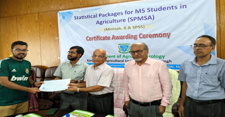 বাংলাদেশ কৃষি বিশ্ববিদ্যালয়ে (বাকৃবি) 'স্ট্যাটিসটিক্যাল প্যাকেজ ফর এমএস স্টুডেন্টস ইন এগ্রিকালচার' শীর্ষক প্রশিক্ষণ কর্মশালার সনদ বিতরণী অনুষ্ঠিত হয়েছে। বৃহস্পতিবার (১৩ জুলাই) দুপুর ১ টার দিকে বিশ্ববিদ্যালয়ের এগ্রোমেটিওরোলজি বিভাগের সম্মেলনে কক্ষে ওই অনুষ্ঠানের আয়োজন করা হয়।