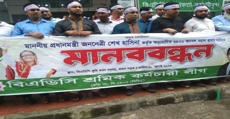 রাজধানীর মতিঝিল এলাকায় কৃষি উৎপাদন প্রবৃদ্ধির স্বার্থে, বিএডিসিকে রক্ষা করতে হবে এর দাবিতে বিএডিসির ভবনের সামনে মানববন্ধন কর্মসুচি পালন করেন বিএডিসির কর্মকর্তা ও কর্মচারীরা। ১৬ জুলাই রবিবার সকাল ১০টায় এই কর্মসূচি পালন করা হয়। অর্ধেক জনবলে চলছে বিএডিসির কার্যক্রম। এমন পরিস্থিতিতে কৃষি মন্ত্রণালয় শূন্য পদ পূরণের উদ্যোগ নিলে উল্টো জনবল কাটছাঁট করে অর্থ মন্ত্রণালয়। প্রতিষ্ঠানটির জনবল কাঠামো ৬ হাজার ৮০০ থেকে ৩ হাজার ১৭ জনে নামিয়ে গত ১৯ জুন পরিপত্রও জারি করে। এমন সিদ্ধান্তের প্রতিবাদে আজ রোববার আন্দোলনে নামেন কর্মচারীরা। বিএডিসি শ্রমিক-কর্মচারী লীগের ব্যানারে সকালে রাজধানীর মতিঝিলের কৃষি ভবনের সামনে তারা মানববন্ধন করে। এদিকে পরিপত্র সংশোধনের জন্য অর্থ মন্ত্রণালয়ের সঙ্গে দেনদরবার চালিয়ে যাচ্ছে কৃষি মন্ত্রণালয় ও বিএডিসি।