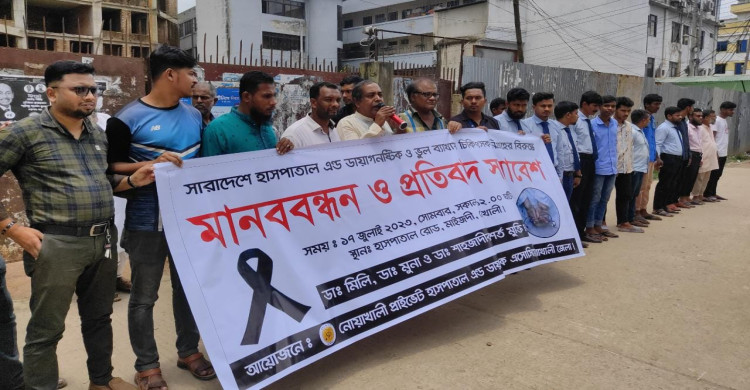 নোয়াখালীতে প্রাইভেট হাসপাতালে চিকিৎসকদের সেবা বন্ধ, গ্রেপ্তারকৃতদের মুক্তির দাবিতে মানববন্ধন