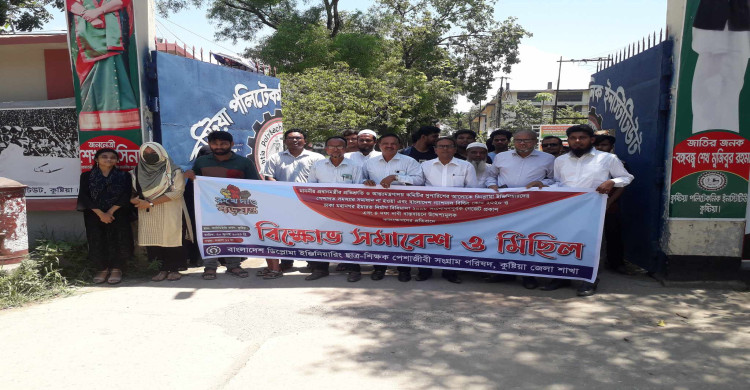 বৃহস্পতিবার (২০ জুলাই) সকাল ১১ টায় কুষ্টিয়া পলিটেকনিক্যাল কলেজ চত্বরে বাংলাদেশ ডিপ্লোমা ইঞ্জিনিয়ার্স কুষ্টিয়া শাখা এই বিক্ষোভ সমাবেশ ও মিছিলের আয়োজন করে।