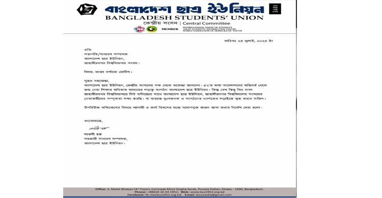 রবিবার (২৩ জুলাই) সংগঠনের ছাত্র ইউনিয়নের সহকারী সাধারণ সম্পাদক লাভলী হক সাক্ষরিত একটি আভ্যন্তরীণ চিঠিতে তিন দিনের মধ্যে তাদের কারণ দর্শানোর নোটিশের জবাব দেওয়ার নির্দেশ দেওয়া হয়েছে।