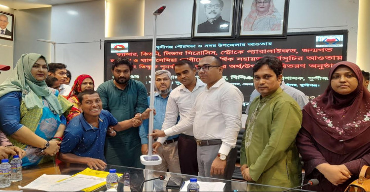 মুন্সিগঞ্জে সমাজসেবা কার্যালয় কর্তৃক ক্যান্সার, কিডনি, লিভার সিরোসিস, স্ট্রোকে প্যারালাইসড, জন্মগত হৃদরোগ, থ্যালাসেমিয়া রোগীদের আর্থিত সহায়তা কর্মসূচির আওতায় চেক এবং ভিক্ষুক পূর্ণবাসনের অনুদানের চেক ও উপকরণ বিতরণ করা হয়েছে।