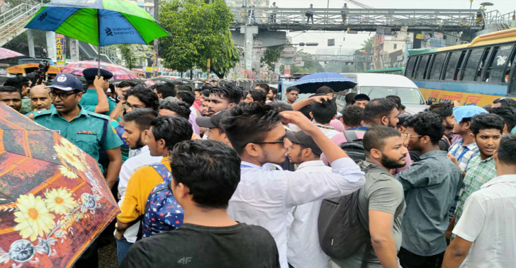 সোমবার (৭ আগস্ট) দুপুর ১টা ২০ মিনিটে দিকে শাহবাগ থেকে মিছিল নিয়ে সায়েন্সল্যাব মোড়ে এসে জড়ো হয় শিক্ষার্থীরা।