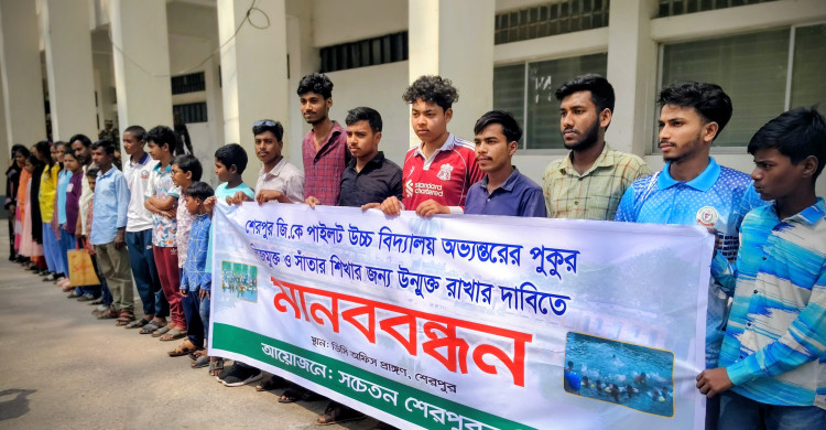 শেরপুরে সাঁতারের জন্য পুকুর লিজ মুক্ত করার দাবিতে শিশুদের মানববন্ধন অনুষ্ঠিত