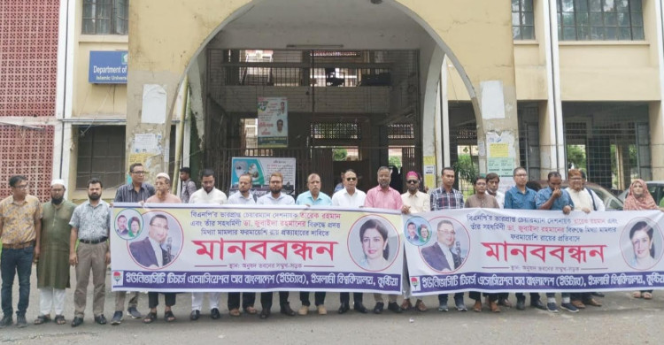 বিএনপি'র ভারপ্রাপ্ত চেয়ারম্যান তারেক রহমান এবং তাঁর স্ত্রী ডাঃ জোবায়দা রহমানের বিরুদ্ধে প্রদত্ত ফরমায়েশী রায় প্রত্যাহারের দাবিতে মানববন্ধন করেছে ইউনিভার্সিটি টিচার্স অ্যাসোসিয়েশন অব বাংলাদেশের (ইউট্যাব) ইসলামী বিশ্ববিদ্যালয় (ইবি) শাখা। মঙ্গলবার (৮ আগস্ট) বেলা সাড়ে ১১টার দিকে বিশ্ববিদ্যালয়ের অনুষদ ভবনের সামনে মানববন্ধনটি অনুষ্ঠিত হয়। এতে বিশ্ববিদ্যালয়ের বিএনপি পন্থী প্রায় ২৫ জন শিক্ষক অংশ নেন।