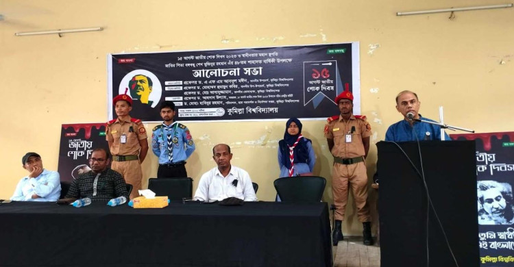 ১৫ আগস্ট জাতীয় শোক দিবস ২০২৩ ও স্বাধীনতার মহান স্থপতি জাতির পিতা বঙ্গবন্ধু শেখ মুজিবুর রহমানের ৪৮ তম শাহাদত বার্ষিকী উপলক্ষে কুমিল্লা বিশ্ববিদ্যালয়ে (কুবি) একটি আলোচনা সভা অনুষ্ঠিত হয়েছে। মঙ্গলবার (১৫ আগস্ট) বিশ্ববিদ্যালয়ের প্রশাসনিক ভবনের ৪১১ নম্বর কক্ষে ছাত্র পরামর্শক ও নির্দেশনা দপ্তরের পরিচালক ড. মুহাম্মদ হাবিবুর রহমানের সঞ্চালনায় এই আলোচনা সভা অনুষ্ঠিত হয়।
