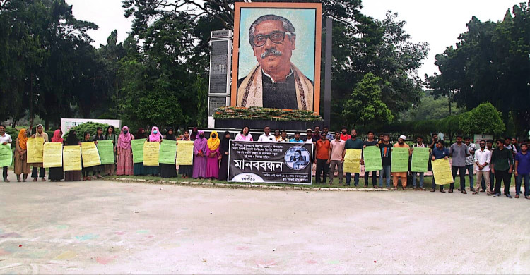 মানববন্ধনে বিশ্ববিদ্যালয়ের প্রগতিশীল শিক্ষক সংগঠন শাপলা ফোরামের সাধারণ সম্পাদক প্রফেসর ড. মাহবুবর রহমান, আইন ও ভূমি ব্যবস্থাপনা বিভাগের সভাপতি সহকারী অধ্যাপক সহিদা আখতার ও বন্ধন-৩২ ব্যাচের অর্ধশতাধিক শিক্ষার্থী উপস্থিত ছিলেন।