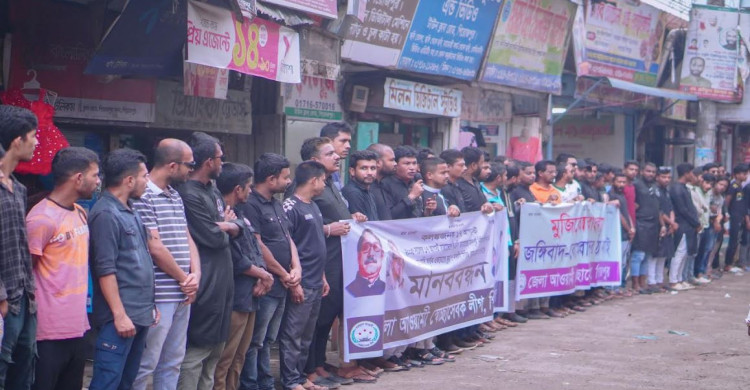 সিরিজ বোমা হামলার প্রতিবাদে পিরোজপুরে স্বেচ্ছাসেবকলীগের মানববন্ধন