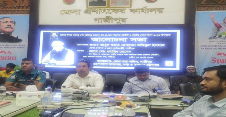 জাতির পিতা বঙ্গবন্ধু শেখ মুজিবুর রহমানের ৪৮ তম শাহাদাত বার্ষিকী ও জাতীয় শোক দিবস উপলক্ষে গাজীপুরে আলোচনা সভা ও দোয়া মাহফিল অনুষ্ঠিত হয়েছে।গাজীপুর জেলার তথ্য অফিসের উদ্যোগে সকালে জেলা প্রশাসক কার্যালয়ের ভাওয়াল সম্মেলন কক্ষে এ সভা অনুষ্ঠিত হয়।উপ-পরিচালক (ভারপ্রাপ্ত) স্থানীয় সরকার এবং অতিরিক্ত জেলা প্রশাসক (সার্বিক) ওয়াহিদ হোসেনের সভাপতিত্বে প্রধান অতিথি হিসেবে আলোচনা সভায় উপস্থিত ছিলেন জেলা প্রশাসক আবুল ফাতে মোহাম্মদ সফিকুল ইসলাম।