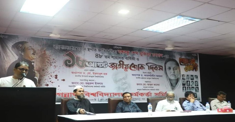 জগন্নাথ বিশ্ববিদ্যালয় কর্মকর্তা সমিতির সভাপতি মোঃ জহুরুল ইসলামের সভাপতিত্বে আলোচনা সভায় বিশেষ অতিথির বক্তব্যে বিশ্ববিদ্যালয়ের ট্রেজারার অধ্যাপক ড. কামালউদ্দীন আহমদ বলেন, ‘বঙ্গবন্ধুকে আমরা যেরকম ভালোবাসি সেটা যেনো ১৫ আগস্টের মতো না হয়। বর্তমান সরকার আবারো ক্ষমতায় আসবে সেটা যেনো আমাদের চিন্তা চেতনা আর কর্মে প্রকাশ পায়। স্বাধীনতা বিরোধীরা দেশি-বিদেশি শক্তি নিয়ে আবারো উঠে পড়ে লাগছে, বঙ্গবন্ধু ও মুক্তিযুদ্ধ বিরোধীগোষ্ঠী এদেশে যতদিন থাকবে ততদিনই তারা দেশে অস্থিতিশীল পরিস্থিতি সৃষ্টি করার পাঁয়তারা করবে। আর একারনেই আমাদের আরও বেশি সতর্ক থাকতে হবে।’