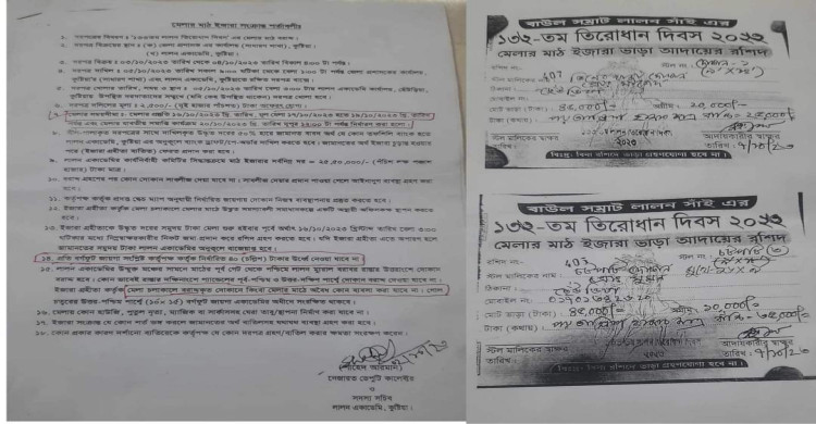 মেলার ১৪ নম্বর শর্তে আছে 'প্রতি বর্গফুট জায়গা সংশ্লিষ্ট কর্তৃপক্ষ কর্তৃক নির্ধারিত ৪০ টাকার উর্ধ্বে নেওয়া যাবেনা'। অথচ মেলার ৯ ফুট বাই ১৪ ফুটের ১ নং দোকান তিলের খাজার জন্য ৪৫ হাজার টাকায় বরাদ্দ দেওয়া হয়েছে। শর্ত অনুযায়ী এই দোকানের বরাদ্দ মুল্য ৪০ টাকা বর্গফুট অনুযায়ী এরমুল্য হয় ৫ হাজার ৩ শত টাকা। একইভাবে দেখা যায়, স্টল নং ৩ যার আয়তন ১৬ ফুট বাই ৯ ফুট। ৪০ টাকা বর্গফুট অনুযায়ী এরমুল্য হয় ৫ হাজার ৭৬০ টাকা। অথচ আদায় করা হয়েছে ৪৫ হাজার টাকা। রসিদে অর্থ আদায়ের তারিখ ৭ অক্টোবর ২০২৩। ১৬ অক্টোবরের আগেই কিভাবে মেলা বসছে? নির্ধারিত মুল্যের অতিরিক্ত অর্থ কেন আদায় করা হচ্ছে? প্রশাসনের দেওয়া কোন শর্তই মানছে না ইজারাদার। দলীয় ক্যাডারবাহিনী দিয়ে মাঠে যা ইচ্ছে তাই করছে। এ বিষয়ে ইজারদারের বিরুদ্ধে আইনগত ব্যবস্থা গ্রহন ও মেলার শর্তভঙ্গের দায়ে প্রশাসনিক ব্যবস্থা গ্রহনের দাবী লালন ভক্ত অনুরাগীদের।