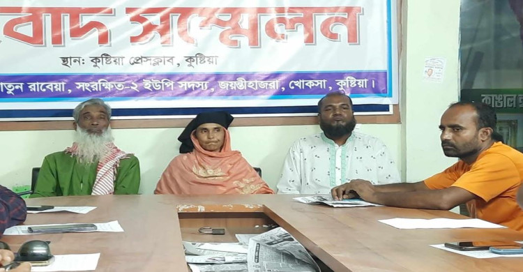 কুষ্টিয়ার খোকসা উপজেলার জয়ন্তীহাজরা ইউনিয়নের ফুলবাড়ী গ্রামে মামলার আসামীদের অত্যাচারে ৫ মাস বাড়ী ছাড়া অন্যত্র মানবেতর জীবন কাটাচ্ছে নারী ইউপি সদস্য রিনা খাতুন রাবেয়ার পরিবার। আসামীদের দ্রæত গ্রেফতার ও বিচার চেয়ে এবং বাড়ী ফেরার দাবীতে সংবাদ সম্মেলন করেছেন রিনা খাতুন।
