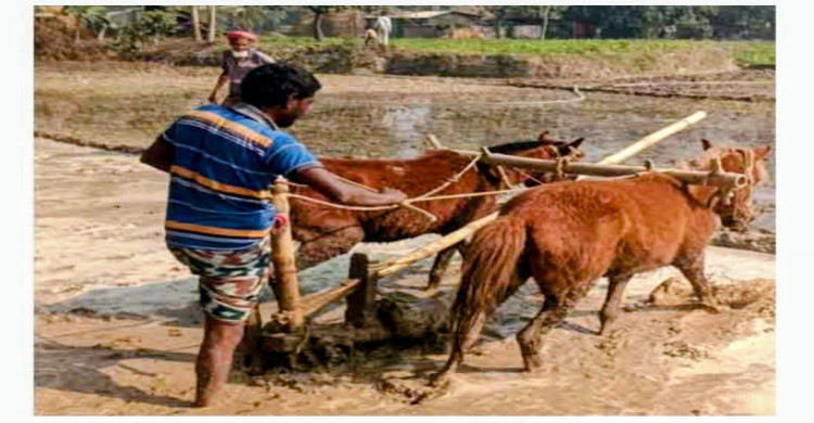 তানোরে গরুর বদলে ঘোড়া দিয়ে বোরো জমিতে হালচাষ