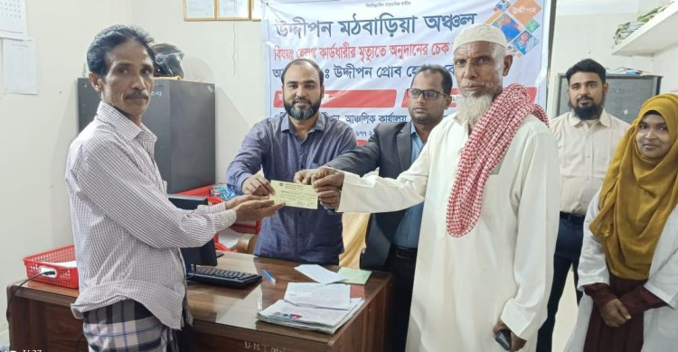 বেসরকারি উন্নয়ন সংস্থা উদ্দীপন মঠবাড়িয়া অঞ্চলের মঠবাড়িয়া শাখায় স্বাস্থ্য কর্মসূচির আওতায় হেলথ্ কার্ডধারী দুই জন সদস্যের মৃত্যুতে তাদের নমিনীর কাছে এক লক্ষ পঞ্চাশ হাজার টাকার অনুদানের চেক হস্তান্তর করেন উদ্দীপন। এ সময় উপস্থিত ছিলেন উদ্দীপনের মঠবাড়িয়া অঞ্চলের আঞ্চলিক ব্যবস্থাপক কাইয়ুম মৃধা, শাখা ব্যবস্থাপক বিধান পাইক, সহকারী কমিউনিটি মেডিকেল অফিসার সাবিহা আক্তার। উল্লেখ্য উদ্দীপনের সেবা মাসে মঠবাড়িয়া শাখায় কর্মরত এফসিও সুদেব রায় ও হেলাল উদ্দীন গ্রুপে গিয়ে হেলথ্ কার্ডের সুবিধা সম্পর্কে জানান এবং কার্ড করতে উদ্বুদ্ধ করেন। এরপরে মাছুমা বেগম ও সীমা রানী আগ্রহী হয়ে হেলথ্ কার্ড করেন এবং দুই মাস পরেই কার্ডধারী মারা যান। উদ্দীপন এর দেওয়া কথা ও হেলথ্ কার্ড এর সুবিধা অনুযায়ী মৃত মাছুমা বেগম এর নমিনী কালাম মোল্লা ও মৃত সীমা রানীর নমিনী সুনীল সমাদ্দার এর হাতে মোট দেড় লক্ষ টাকার চেক প্রদান করে উদ্দীপন।