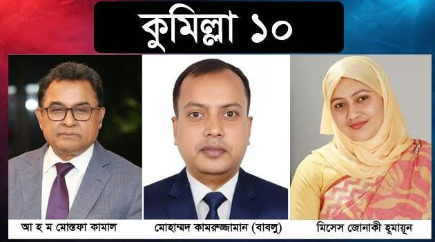 আগামী দ্বাদশ জাতীয় সংসদ নির্বাচনে কুমিল্লা সংসদীয় আসন ১০ থেকে মনোনয়নপত্র জমা ৭জন। তারমধ্যে যাছাই-বাছাইয়ে ৪ জনের মনোনয়ন বাতিল হওয়ায় বৈধতা পেয়েছেন ৩জন। তারা হলেন কুমিল্লা দক্ষিণ জেলা আওয়ামীলীগের সভাপতি ও বাংলাদেশ সরকারের অর্থমন্ত্রী আ হ ম মোস্তফা কামাল, জাতীয় পার্টির জোনাকি হুমায়ন ও বাংলাদেশ কংগ্রেসের মোহাম্মদ কামরুজ্জামান (বাবলু)।