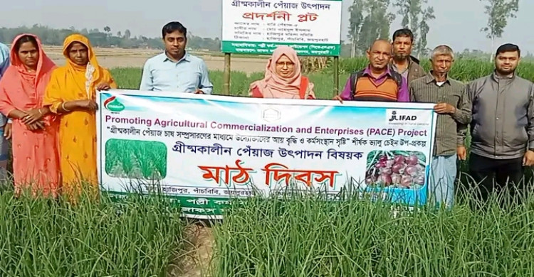 অধিক পরিমানে কৃষি পণ্য উৎপাদনের মাধ্যমে দেশের মানুষের চাহিদা পূরনের লক্ষে জয়পুরহাট জেলার পাঁচবিবি উপজেলার ধরঞ্জী ইউনিয়নের হাজিপাড়ায় কৃষি মাঠ দিবস অনুষ্ঠিত হয়েছে। বুধবার বিকালে গ্রীষ্মকালীন পেঁয়াজ চাষ সম্প্রসারণের মাধ্যমে উদ্যোক্তাদের আয় বৃদ্ধি শীর্ষক মাঠ দিবসটি জাকস ফাউন্ডেশন আয়োজন করেন। পিকেএসএফের অর্থায়নে মাঠ দিবস অনুষ্ঠানে এলাকার শতাধিক নারী-পুরুষ প্রান্তিক চাষীরা অংশ গ্রহন করেন। সঠিক পদ্ধতি প্রয়োগ করে কৃষির মাধ্যমে অধিক ফলন ও লাভবান করতে কৃষকদের পরামর্শ দেন জয়পুরহাট সদর উপজেলা কৃষি কর্মকর্তা রাফসিয়া জাহান। এসময় উপস্থিত বক্তব্য রাখেন জাকস ফআউন্ডেশনের প্রাণিসম্পদ কর্মকর্তা ডাঃ মোঃ জহুর আলী, আল-জাবির ও শাহাদত হোসেন শাহিন। পরে পেঁয়াজের ক্ষেত পরিদর্শন করেন কর্মকর্তারা।