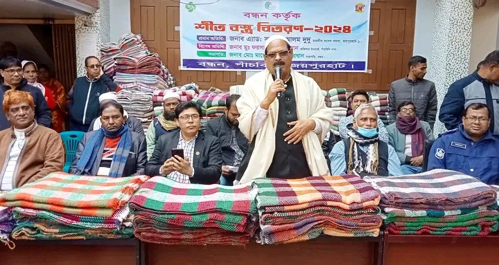 জয়পুরহাটের পাঁচবিবির ঐতিহ্যবাহি বে-সরকারি স্বেচ্ছাসেবী সংগঠন বন্ধন এর উদ্যোগে উপজেলার এক হাজার শীতার্থ গরীব অসহায় পরিবারের মাঝে কম্বল বিতরণ করেন। মঙ্গলবার দুপুরে উপজেলার মাতাইশ মঞ্জিল সংগঠনের প্রধান কার্যালয়ের সামনে কম্বলগুলো বিতরণ করেন জয়পুরহাট-১ আসনের সাংসদ অ্যাডভোকেট সামছুল আলম দুদু এমপি। এসময় উপস্থিত ছিলেন থানার সিনিয়র এসআই মনারুল ইসলাম, পৌর আ,লীগের সভাপতি এস কে আব্দুল হক, স্থানীয় কাউন্সিলর আরিফ রাব্বানী ইস্তি, বন্ধনের সভাপতি মোঃ মাজেদুর রহমান, নির্বাহী পরিচালক সেফাতুর রহমান স্বপন, পরিচালক মনোয়ার হোসেন চৌধুরী ও নির্বাহী প্রশাসনিক পরিচালক বিপ্লব চৌধুরী।