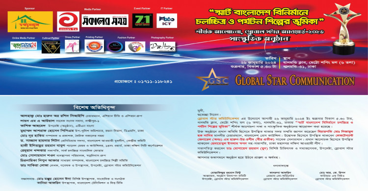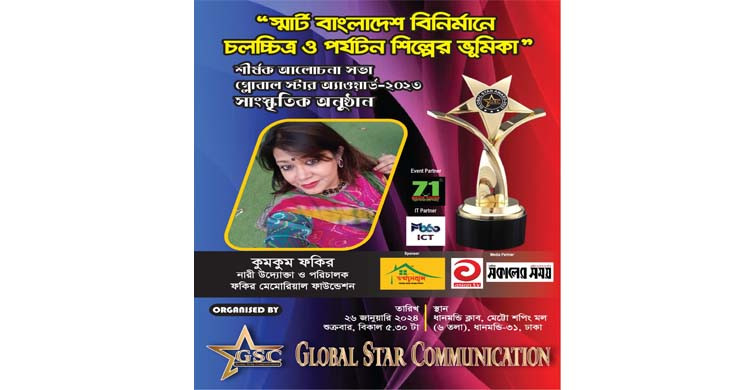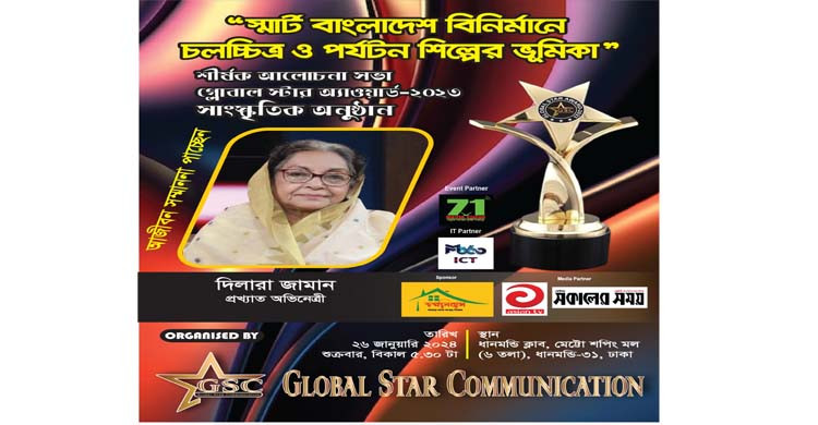 আগামী ২৬ জানুয়ারি ২০২৪ শুক্রবার বিকাল ৫ টা ৩০ গ্লোবাল স্টার কমিউনিকেশন কর্তৃক আয়োজিত"স্মার্ট বাংলাদেশ বিনির্মাণে চলচ্চিত্র ও পর্যটন শিল্পের ভূমিকা আলোচনা সভা,পুরস্কার বিতরণ সাংস্কৃতিক অনুষ্ঠানে আজীবন সন্মাননা পাচ্ছেন প্রখ্যাত অভিনেত্রী দিলারা জামান।