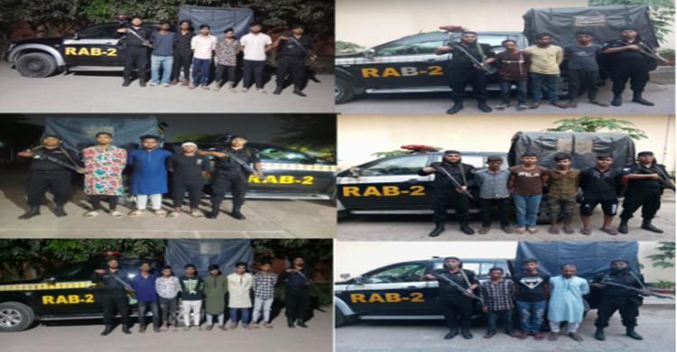 এরই ধারাবাহিকতায় গত ১১ মার্চ থেকে ১৮ মার্চ পর্যন্ত র্যাব-২ এর একাধিক আভিযানিক দল রাজধানীর মোহাম্মদপুর, আদাবর, নাখালপাড়া এলাকায় অভিযান পরিচালনা করে ছিনতাই, চাঁদাবাজিসহ বিভিন্ন সন্ত্রাসী কর্মকান্ডের সাথে জড়িত সন্ত্রাসী গ্যাং ‘এফডিসি মুন্না’ এর অন্যতম মূলহোতা ১) মোঃ ইসমাইল হোসেন,এফডিসি মুন্না (২৮) গ্যাং সদস্য মোঃ আকাশ (২৪) মোঃ ফরিদ, ‘কিং জামাল গ্রুপ’ এর মূলহোতা মোঃ জামাল হোসেন (৩১) মোঃ ইমাম হোসেন (২০) মোঃ আরিফ ওরফে রাসেল মিয়া (২০) কিং মোশারফ গ্রুপ’ এর মোঃ মোশাররফ (৩২) তার সহযোগী মোঃ ফেরদাউস বেপারী (২৫) মোঃ আরমান শেখ (১৮) মোঃ সানি মিয়া (১৮) আপনা ভাই গ্রুপ’ এর মূলহোতা শাকিব ওরফে বস্তি শাকিব (১৯) মোঃ নাহিদ (২০) মোঃ লাদেন (২১) সহ অন্যান্য গ্রুপের মোঃ হৃদয় (২২) মোঃ আবু সিদ্দিক (৪৫) মোঃ খোকন (৩৫) মোঃ নিলয় আহম্মেদ (২৫) মোঃ ইব্রাহিম (২৬) মোঃ বিপ্লব শেখ (২০) রাব্বি হোসাইন (২৪) তারেক জিয়া (২২) মোঃ জামাল (২৬) মোঃ শিমুল (২৩) মোঃ রতন(১৯),মোঃ পলাশ (২৪) মোঃ সাঈদ (২৪) মোঃ শরিফ (২০) মোঃ রাজন (২২) মোঃ মানিক (২৪) মোঃ কবির (২৪) হাসান (২২) মোঃ সাইদ (১৯) মোঃ রাজা শেখ (২৮) মোঃ ইকরাম (২৫) এবং মোঃ বিপ্লব শেখ (২২)এদের’কে গ্রেফতার করা হয়। উদ্ধার করা হয় ছিনতাই ও ডাকাতিসহ বিভিন্ন সন্ত্রাসী কার্যক্রমে ব্যবহৃত দেশীয় অস্ত্র চাপাতি, ছুরি, চাকু, চাইনিজ কুড়াল, এন্ট্রি কাটার ও বিভিন্ন দেশীয় ধারালো অস্ত্র প্রাথমিক জিজ্ঞাসাবাদে গ্রেফতারকৃতরা পূর্বের বিভিন্ন অপরাধ এবং ভবিষ্যতের বিভিন্ন সহিংসতা সৃষ্টির পরিকল্পনা সর্ম্পকে তথ্য প্রদান করে।