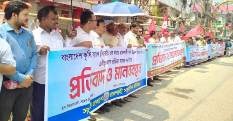 বাংলাদেশ কৃষি ব্যাংক (বিকেবি) ও রাজশাহী কৃষি উন্নয়ন ব্যাংককে (রাকাব) একীভূতকরণ প্রক্রিয়া বন্ধের দাবিতে রাজশাহীতে প্রতিবাদ মানববন্ধন বিক্ষোভ সমাবেশ