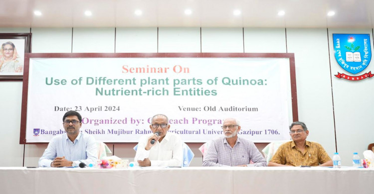 উচ্চপুষ্টিগুণ সম্পন্ন কুইনোয়া সবুজ শাকের বহুবিধ ব্যবহার ও সম্প্রসারণ শীর্ষক সেমিনার অনুষ্ঠিত হয়েছে। মঙ্গলবার সকালে বঙ্গবন্ধু শেখ মুজিবুর রহমান কৃষি বিশ্ববিদ্যালয়ের পুরাতন অডিটরিয়ামে এই সেমিনার অনুষ্ঠিত হয়। সেমিনারে মূল প্রবন্ধ উপস্থাপন করেন যুক্তরাষ্ট্রের লিংকন ইউনিভার্সিটি অব মিশোরী এর সিনিয়র গবেষক কৃষিবিদ শফিউল্লাহ পাঠান।