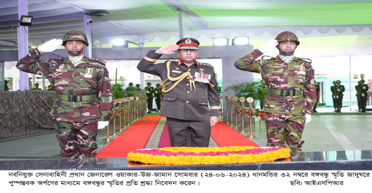 সেনাবাহিনী প্রধান জেনারেল ওয়াকার-উজ- জামান, ওএসপি, এসজিপি, পিএসসি আজ (২৪ জুন ২০২৪) বঙ্গবন্ধু স্মৃতি জাদুঘরে জাতির পিতা বঙ্গবন্ধু শেখ মুজিবুর রহমান এর প্রতিকৃতিতে পুষ্পস্তবক অর্পণের মাধ্যমে শ্রদ্ধা নিবেদন করেন। পরবর্তীতে তিনি সেখানে রক্ষিত পরিদর্শন বইয়ে স্বাক্ষর করেন।