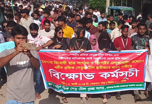 সিংগাইরে ভাষা শহীদ রফিক সেতুর টোল বন্ধে ছাত্র জনতার বিক্ষোভ মিছিল