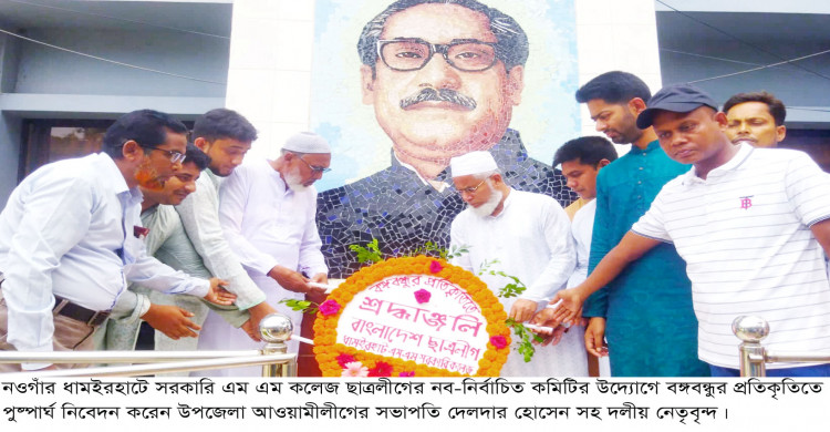 ধামইরহাটে সরকারি এম এম কলেজ ছাত্রলীগের বঙ্গবন্ধুর প্রতিকৃতিতে শ্রদ্ধা নিবেদন