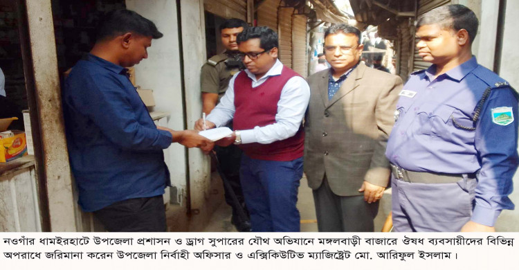 ধামইরহাটে উপজেলা প্রশাসন ও ড্রাগ সুপারের ঝটিকা অভিযানে ঔষুধ দোকানীদের জরিমানা