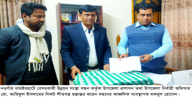 ধামইরহাটে বেসরকারী উন্নয়ন সংস্থা বন্ধন কর্তৃক উপজেলা প্রশাসনে শীতবস্ত্র হস্তান্তর