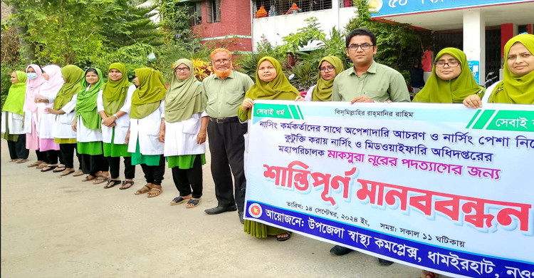 ধামইরহাটে নার্সিং ও মিডওয়াইফারি অধিদপ্তরের মহাপরিচালকের পদত্যাগের দাবিতে মানববন্ধন