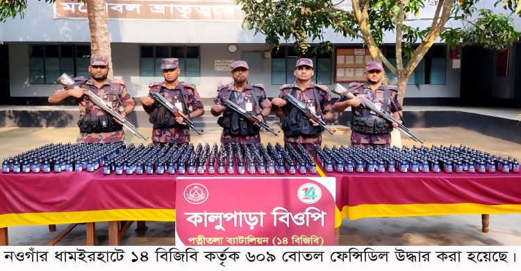 নওগাঁর ধামইরহাট সীমান্তে ১৪ বিজিবি কর্তৃক ৬০৯ বোতল ফেন্সিডিল উদ্ধার
