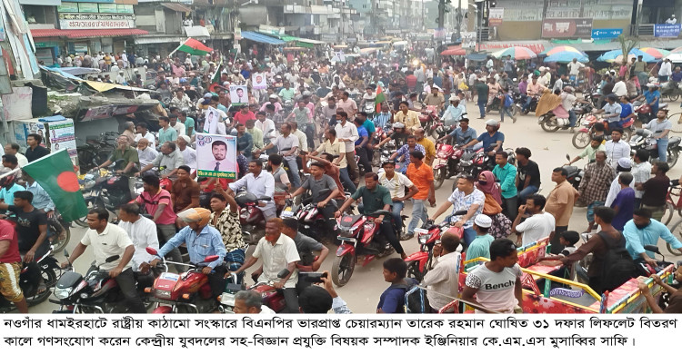 ধামইরহাটে কেন্দ্রীয় যুবদল নেতা মুসাব্বির সাফির গণসংযোগে ৩ হাজার মোটরসাইকেল-৩১ দফার লিফলেট বিতরণ